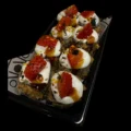Boleta d'arròs de sushi cobert d'ou de guatlla fregit i...